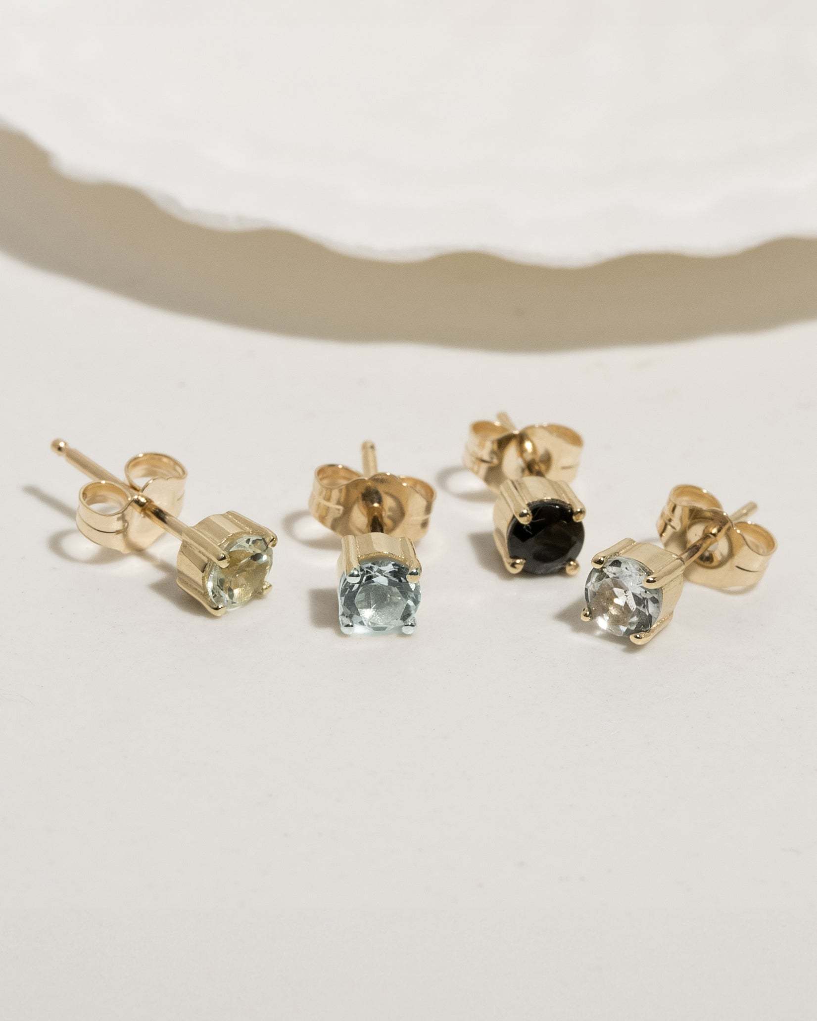Material: 10k solid yellow goldStone: round cut black onyx, clear quartz, aquamarine, or green amethyst; all AAA stones, 0.25 carat weight per stone, 0.50 carat weight per pair of studsDimensions: 4mm stones